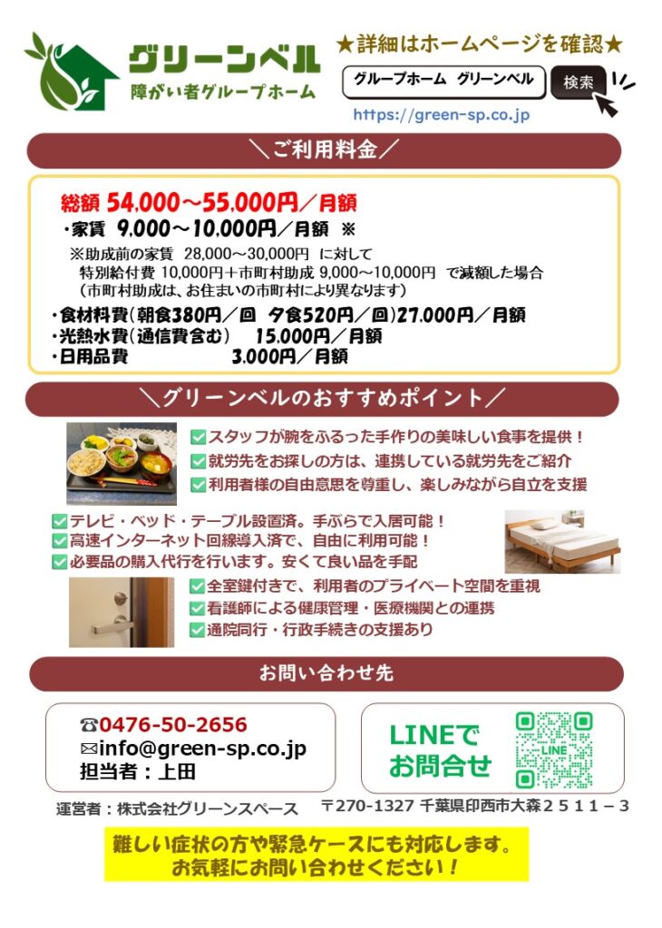 グリーンベルでは、障がいを持つ方の住まいでのお悩みを解決するため、日々利用者様と向き合い、生活サポートを行っています。