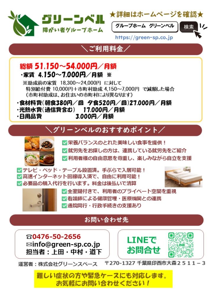 グリーンベルでは、障がいを持つ方の住まいでのお悩みを解決するため、日々利用者様と向き合い、生活サポートを行っています。